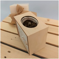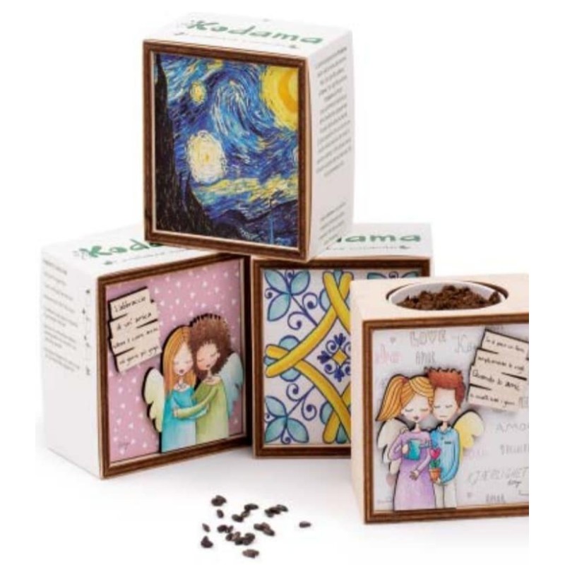 Kodama e’ un cubetto in legno di betulla, con aggiunta di frase emozionale adatta all’occasione ,un regalo green fatto con prodotti naturali contenente un vasetto con del terriccio e dei semini di piante aromatiche o fiori da far crescere pronti per essere piantati