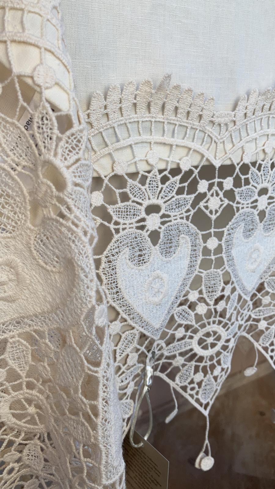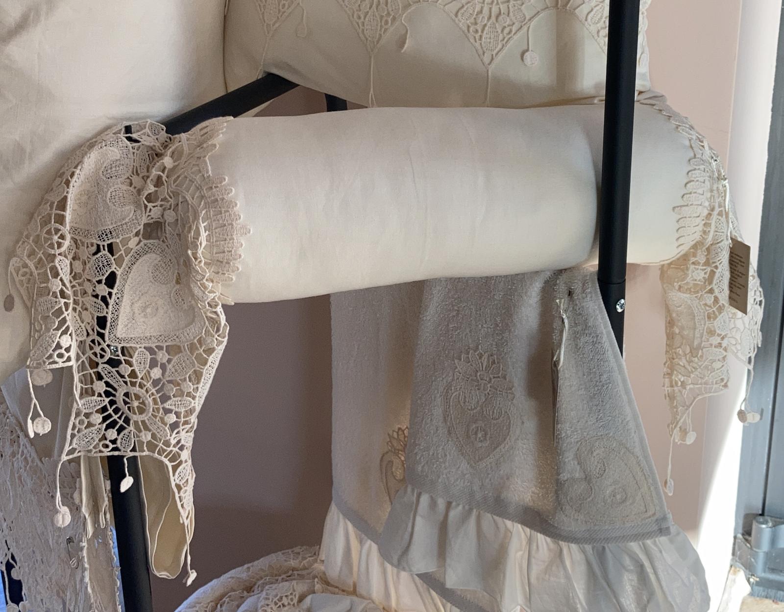 ELEGANTE E RAFFINATO CUSCINO CILINDRICO IN MISTO LINO  E CON RAFFINATI DETTAGLI IN MACRAME’ ,ABBINABILE A CUSCINI,TENDA,RUNNER,CENTROTAVOLA E TRAPUNTA  DELLA STESSA LINEA ” CUORE” .
