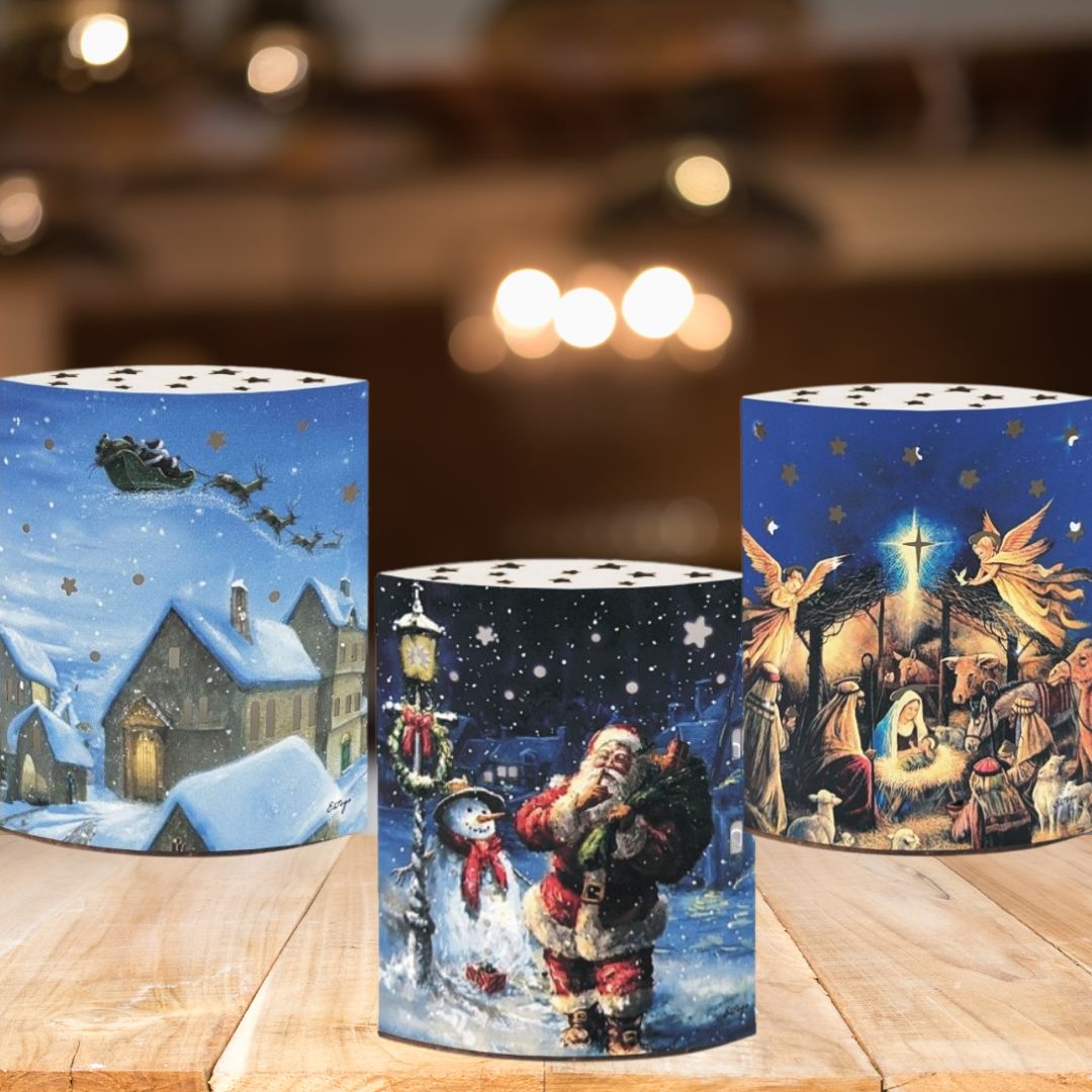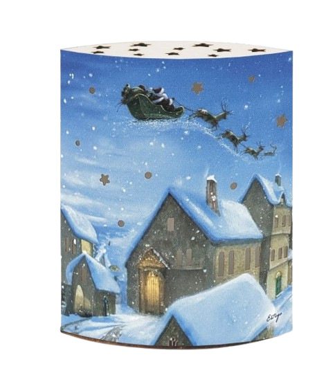 Lampada d’appoggio o da appendere decorata realizzata in legno e cartoncino finemente decorata con immagini natalizie.