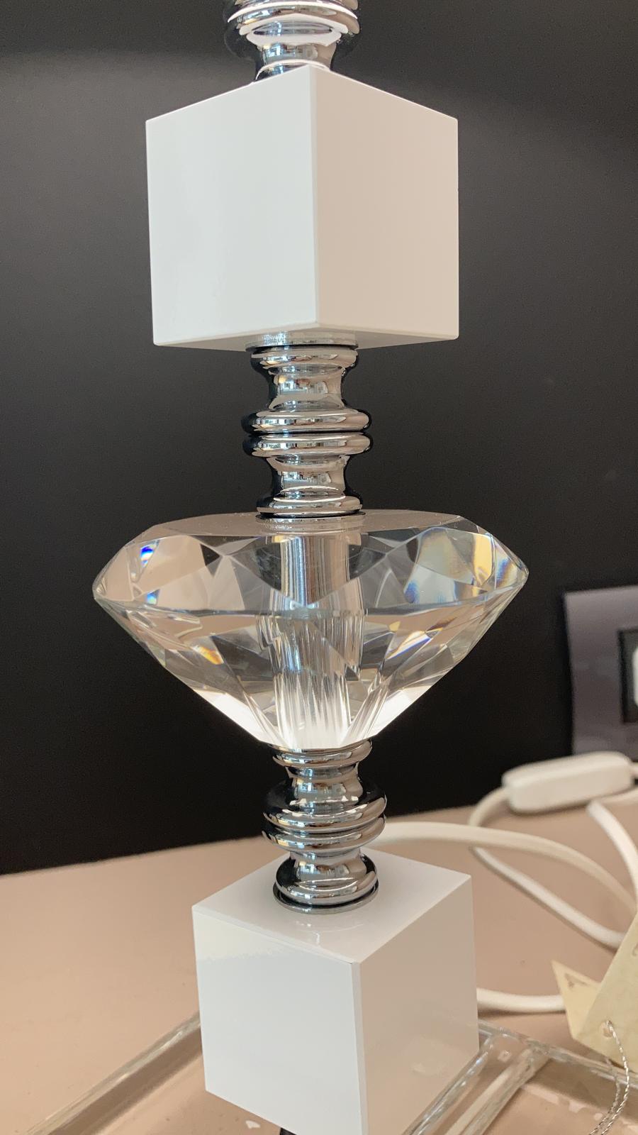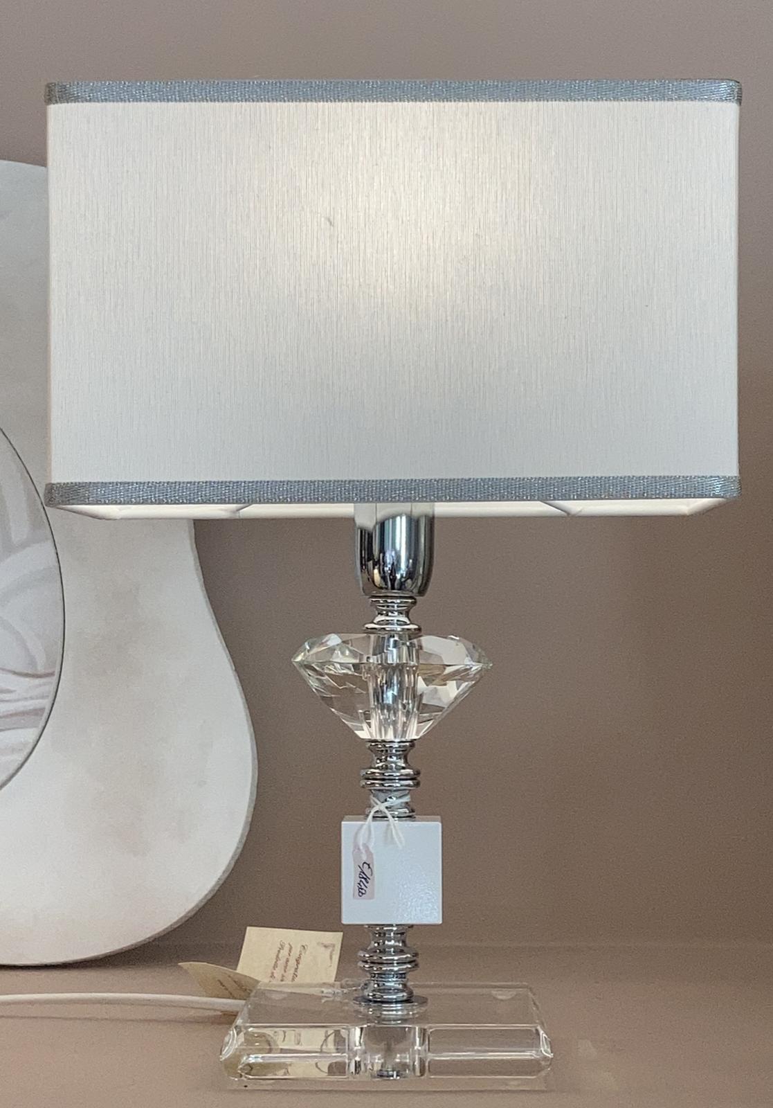 lampada in cristallo motivo parallelepipedo e inserti in cristallo .paralume rettangolare in cotone setificato grigio perla e bordino argento,