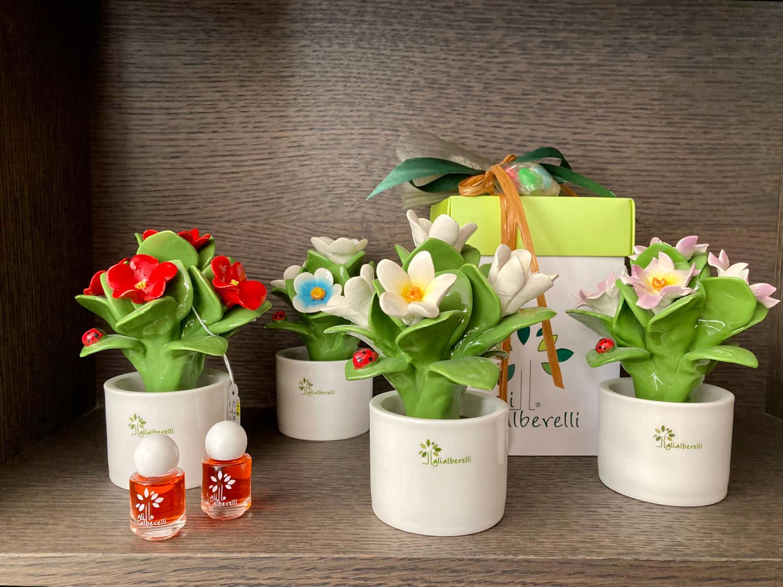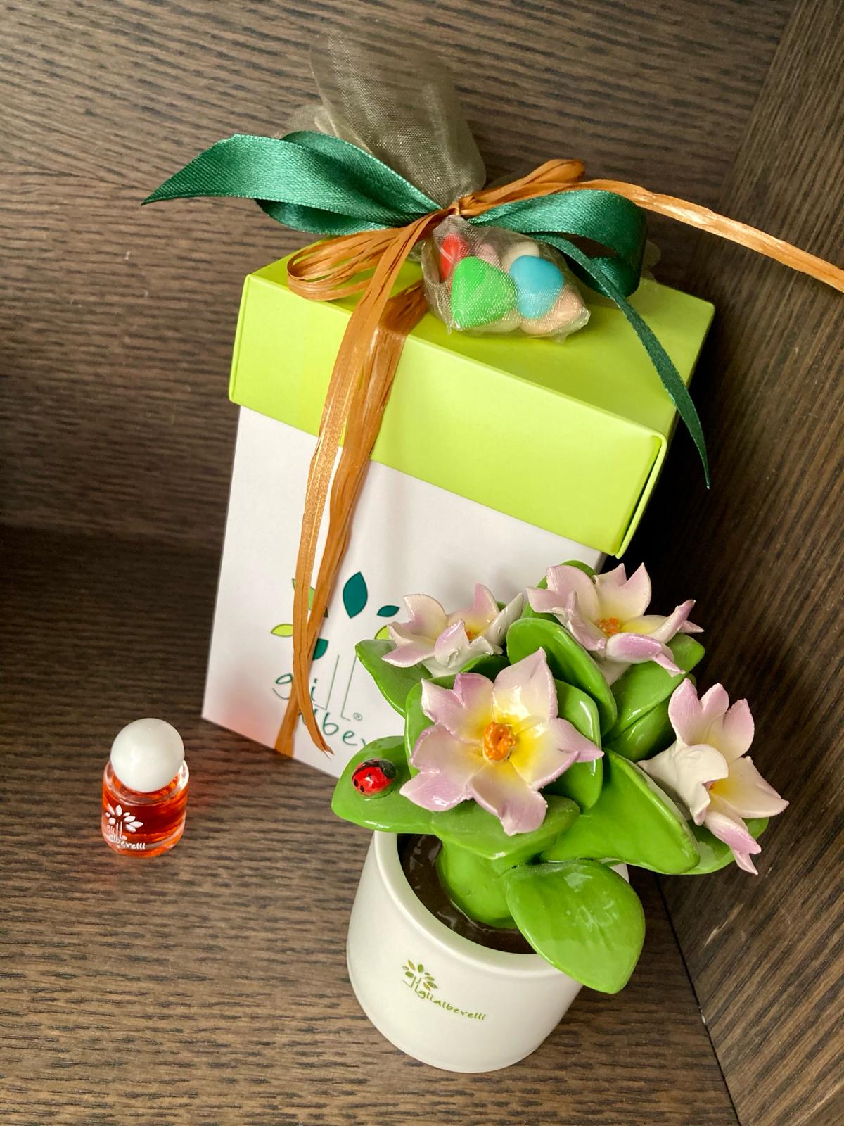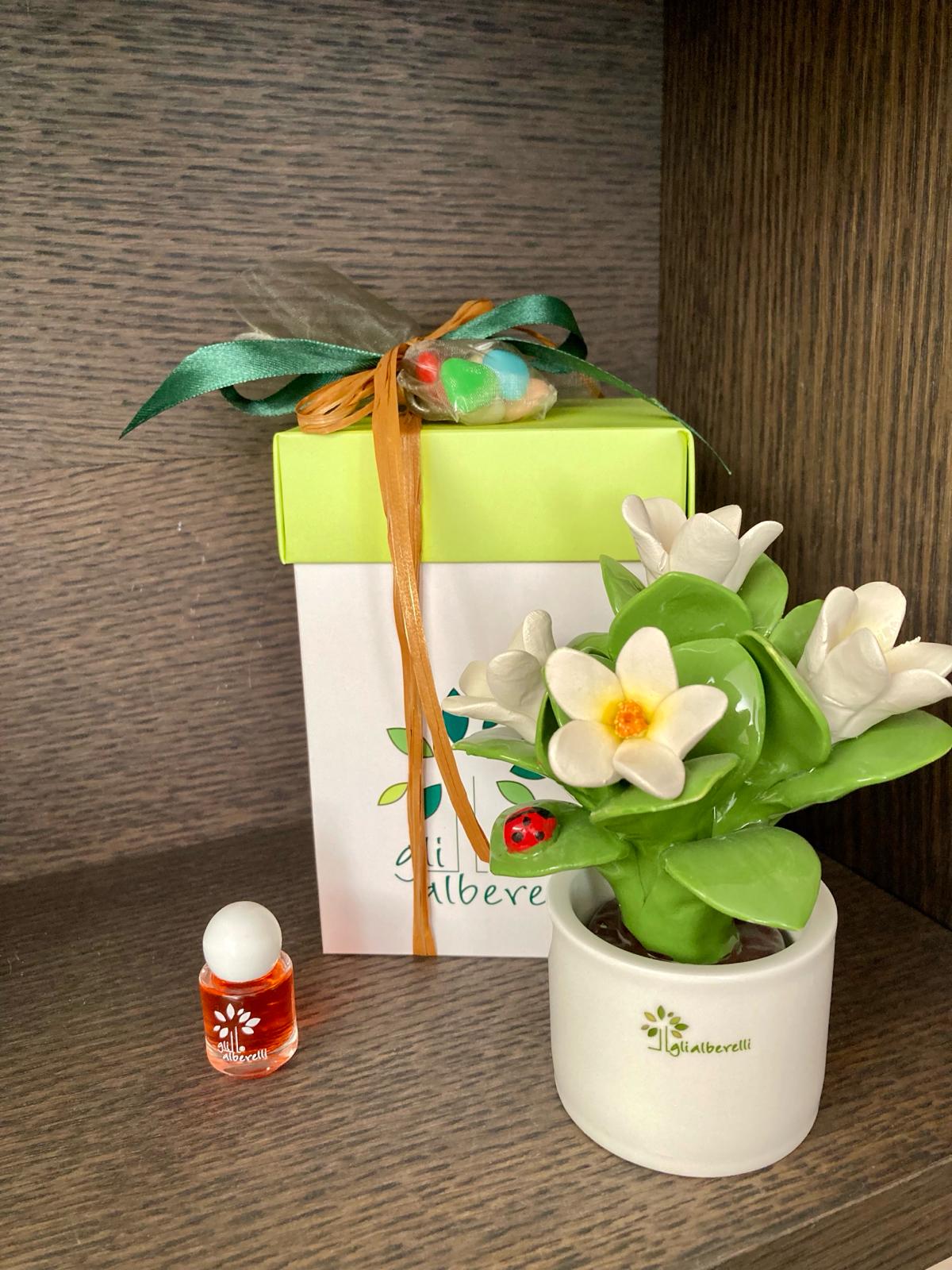 PIANTINA con bouquet di fiori , profumatore tutta in ceramica di Capodimonte completamente realizzata e dipinta a mano in armonia con le tradizioni partenopea con vaso tondo bianco, e’ un diffusore ambiente e centrotavola caratterizzato da forme moderne e dalle calde tinte mediterranee della classica linea di Capodimonte.