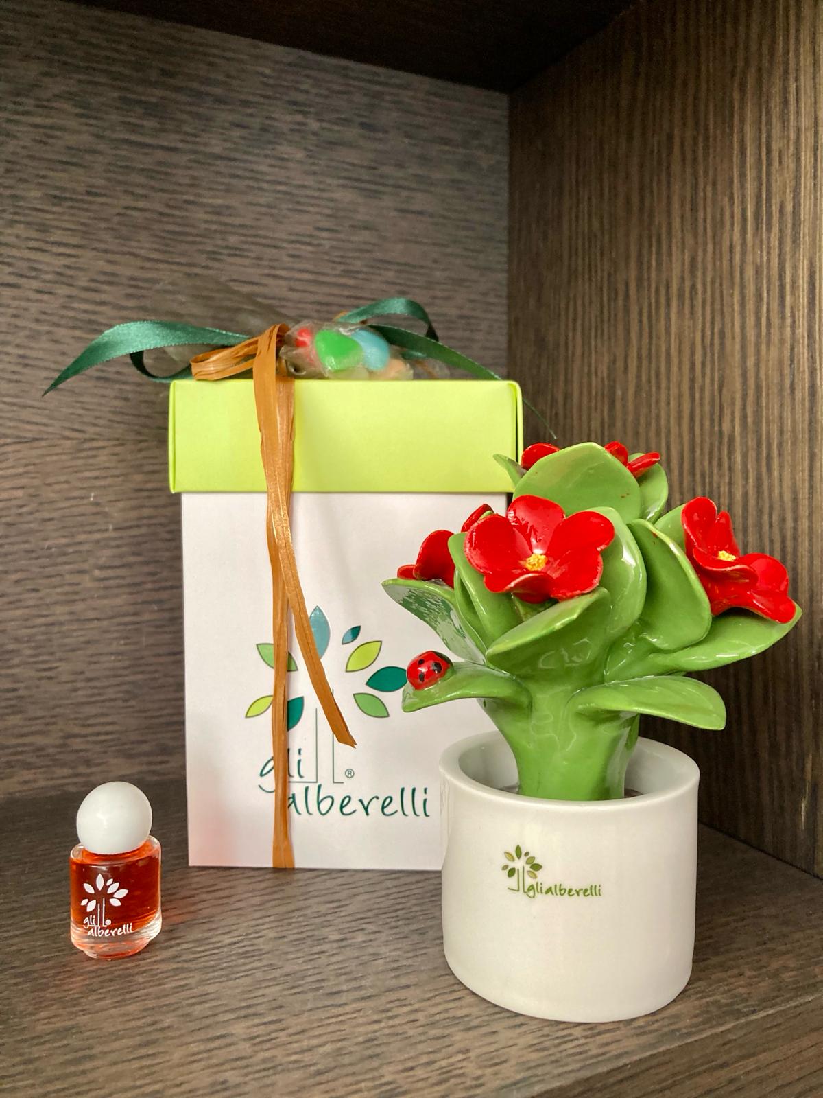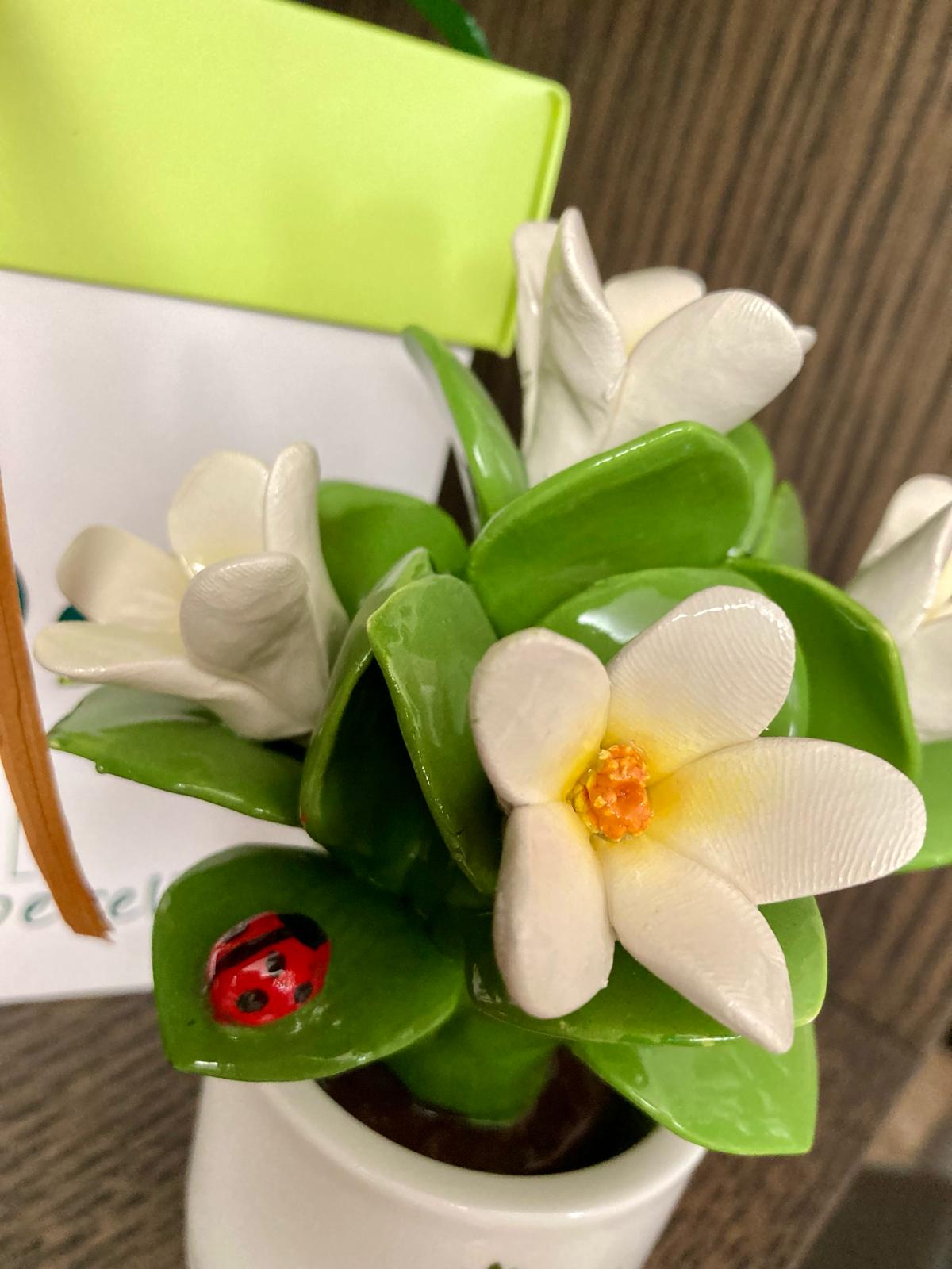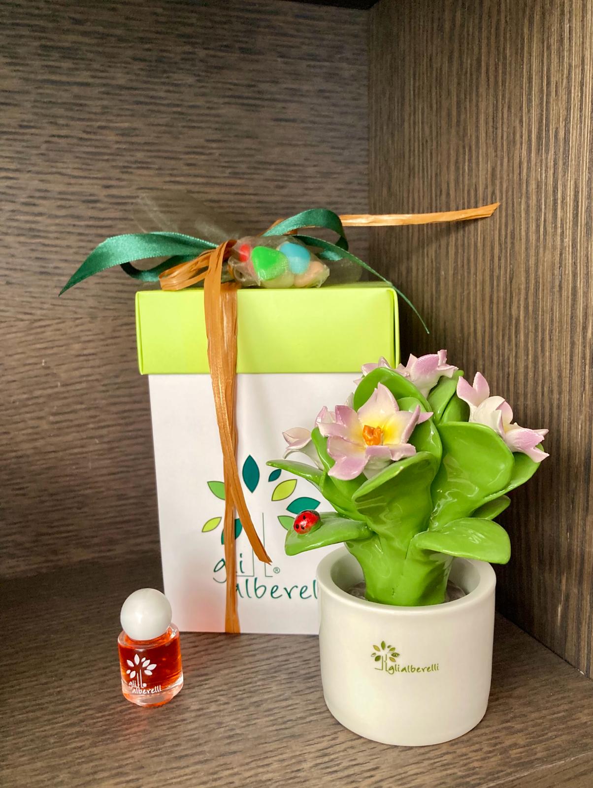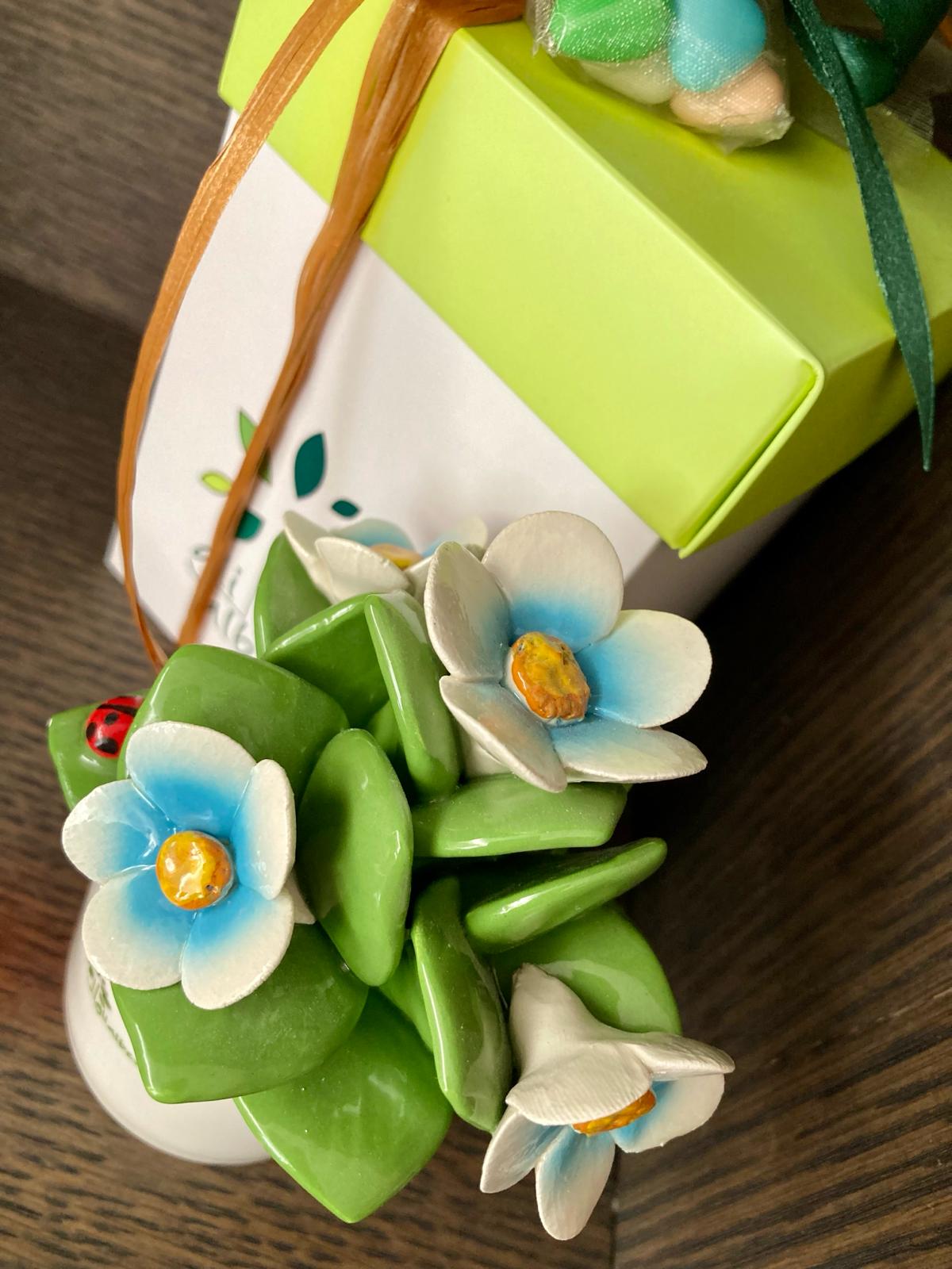 PIANTINA con bouquet di fiori , profumatore tutta in ceramica di Capodimonte completamente realizzata e dipinta a mano in armonia con le tradizioni partenopea con vaso tondo bianco, e’ un diffusore ambiente e centrotavola caratterizzato da forme moderne e dalle calde tinte mediterranee della classica linea di Capodimonte.