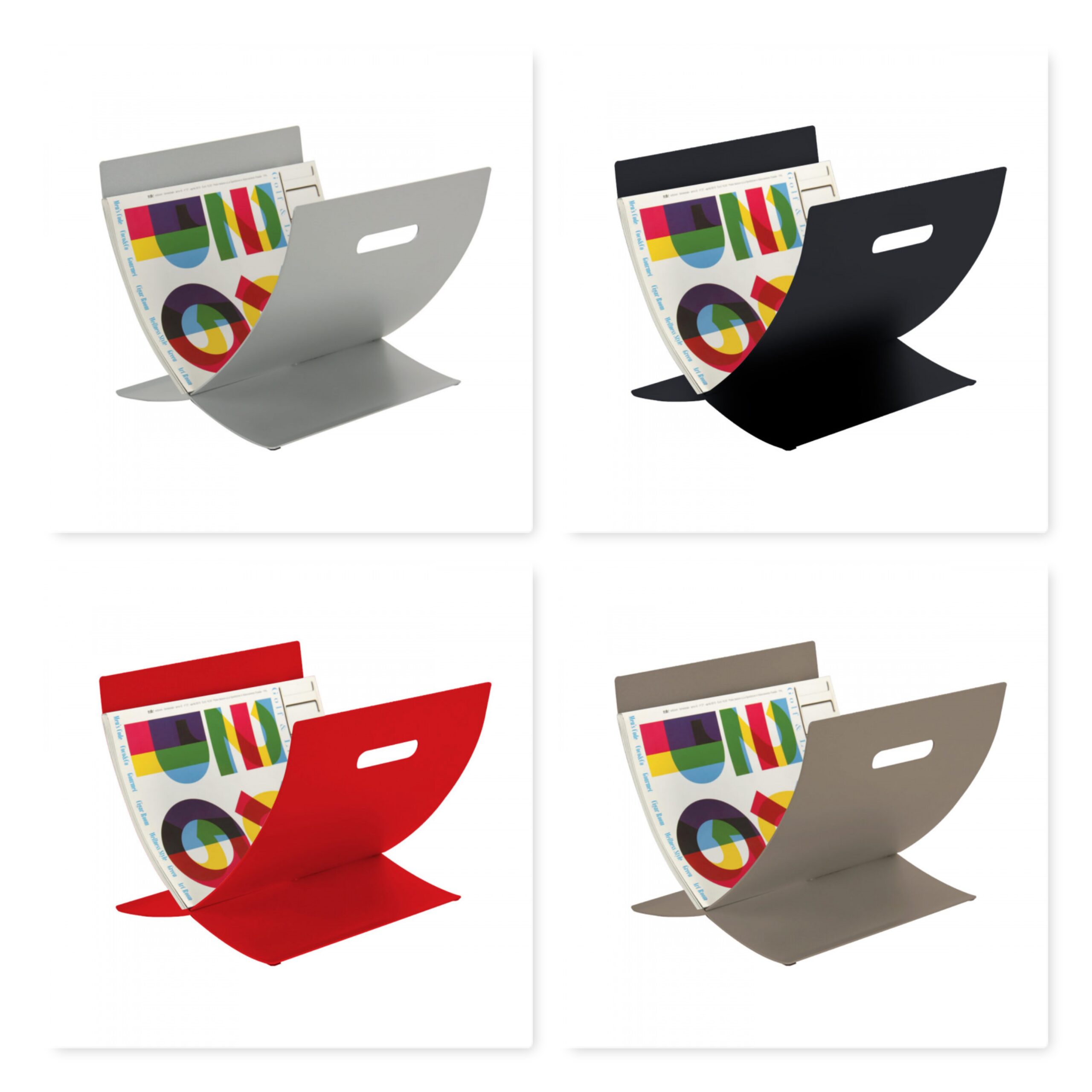 Portariviste dal design moderno ed essenziale formato da due lamine curvate in metallo ,disponibile in diversi colori,