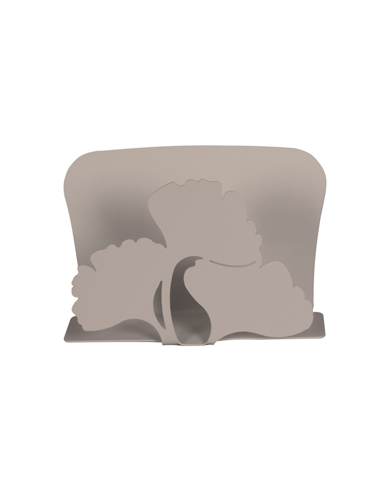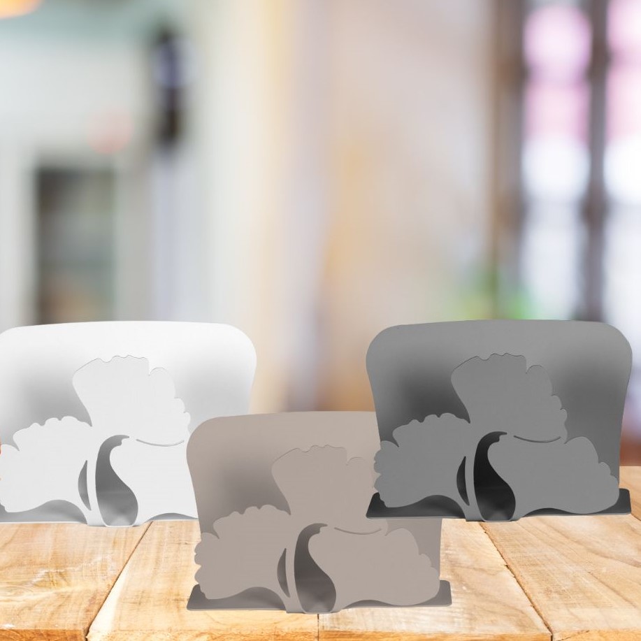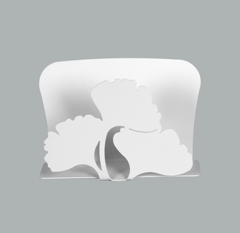 Portatovaglioli da tavolo in metallo dal design moderno con lavorazione che richiama delle foglie di Ginkgo. Portatovaglioli da cucina disponibile in diversi colori realizzato in Italia da Ceart da artigiani specializzati