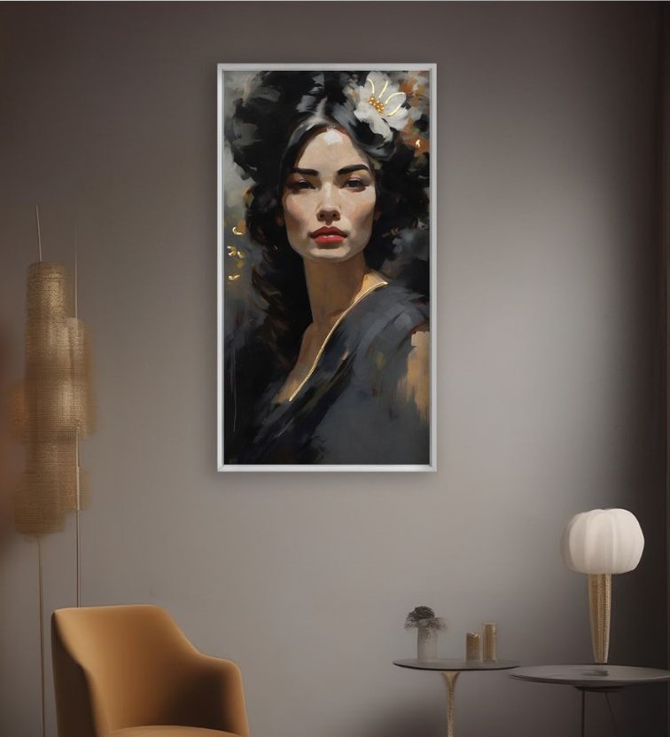 quadr0 verticale figurativo d’arredo , raffigurante il ritratto di una bellissima donna ,e’ una riproduzione di opere originali di artisti ,accuratamente selezionate, decorate e rifinite secondo la tradizione artigiana