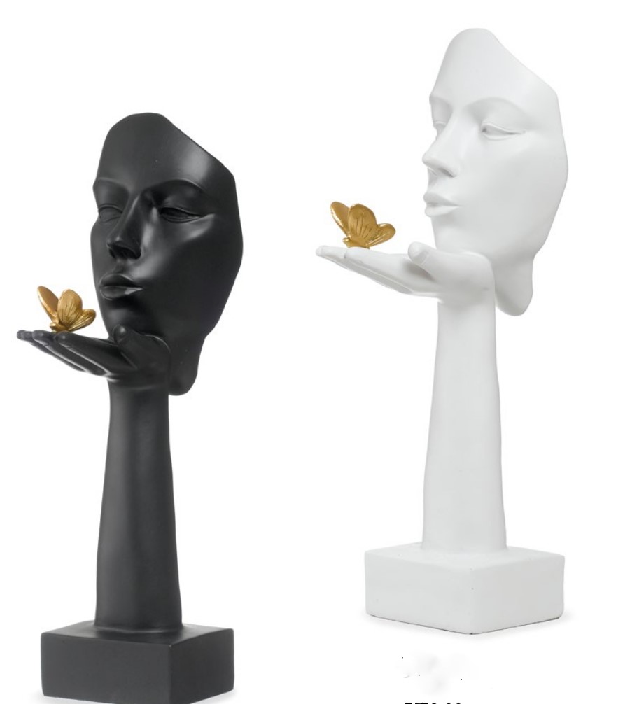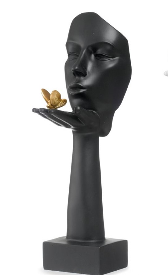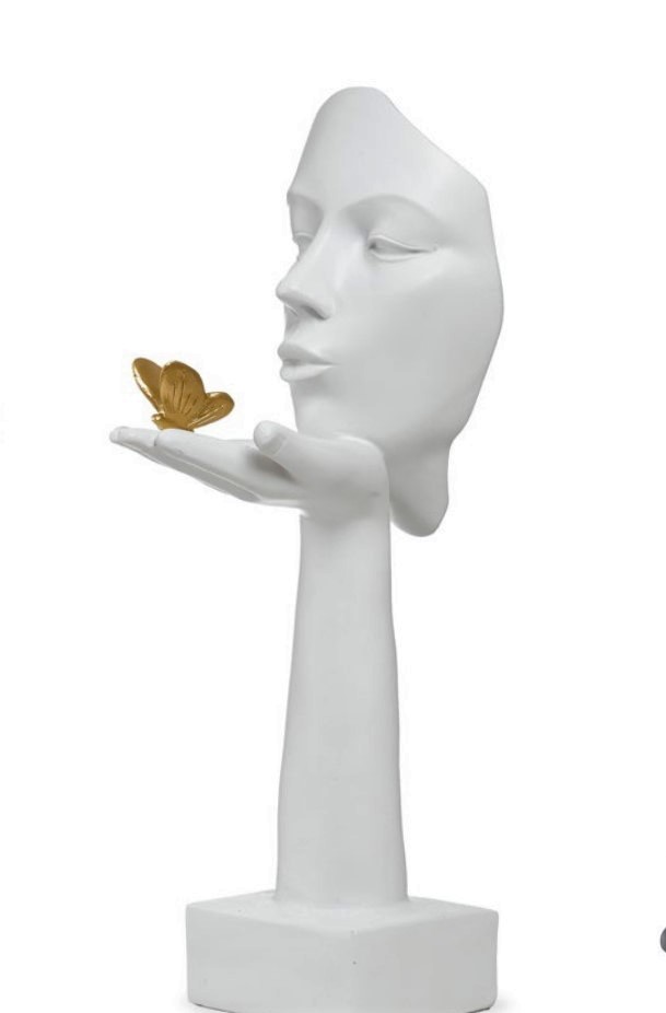 raffinata e moderna scultura in ceramica raffigurante un bellissimo viso che soffia su una farfalla dorata