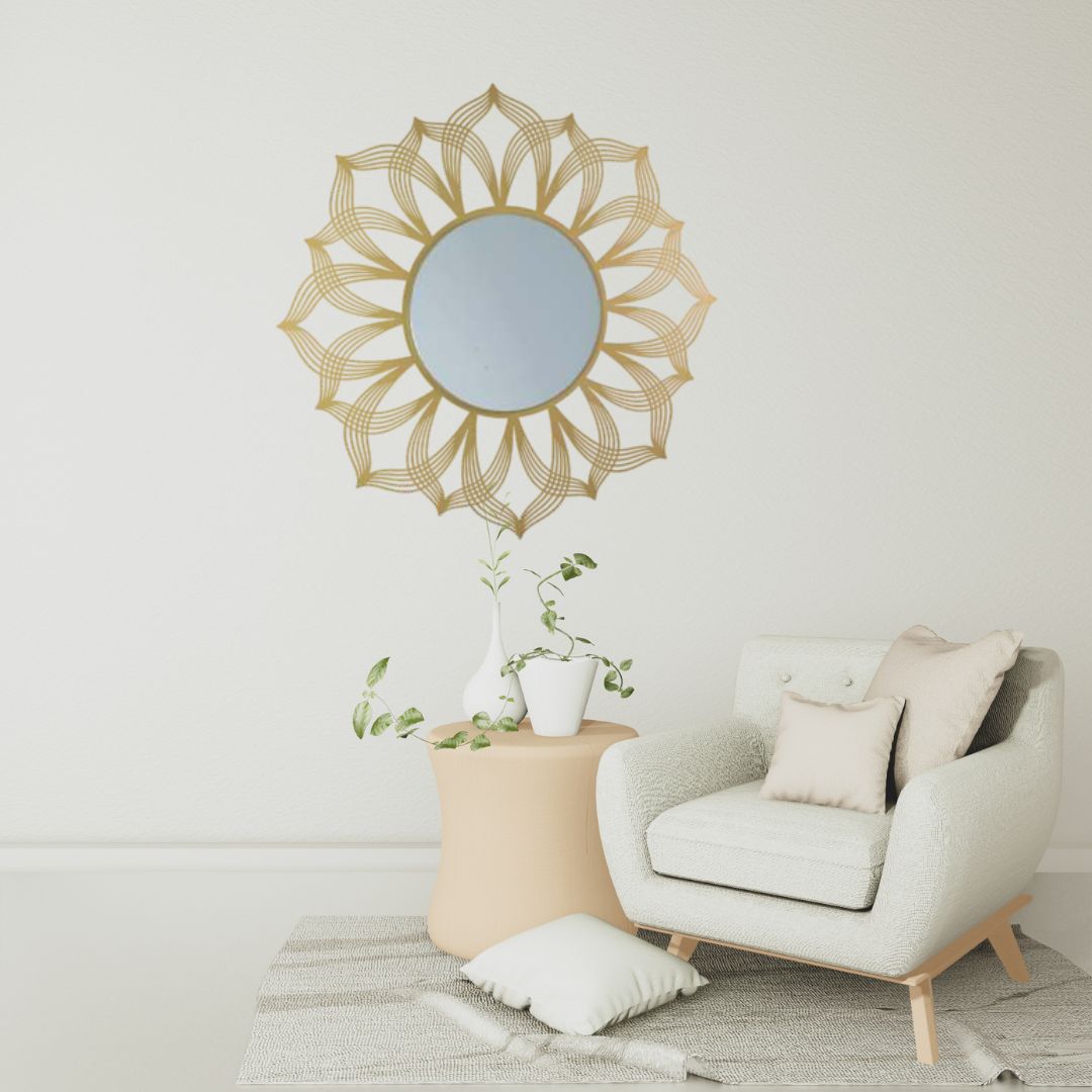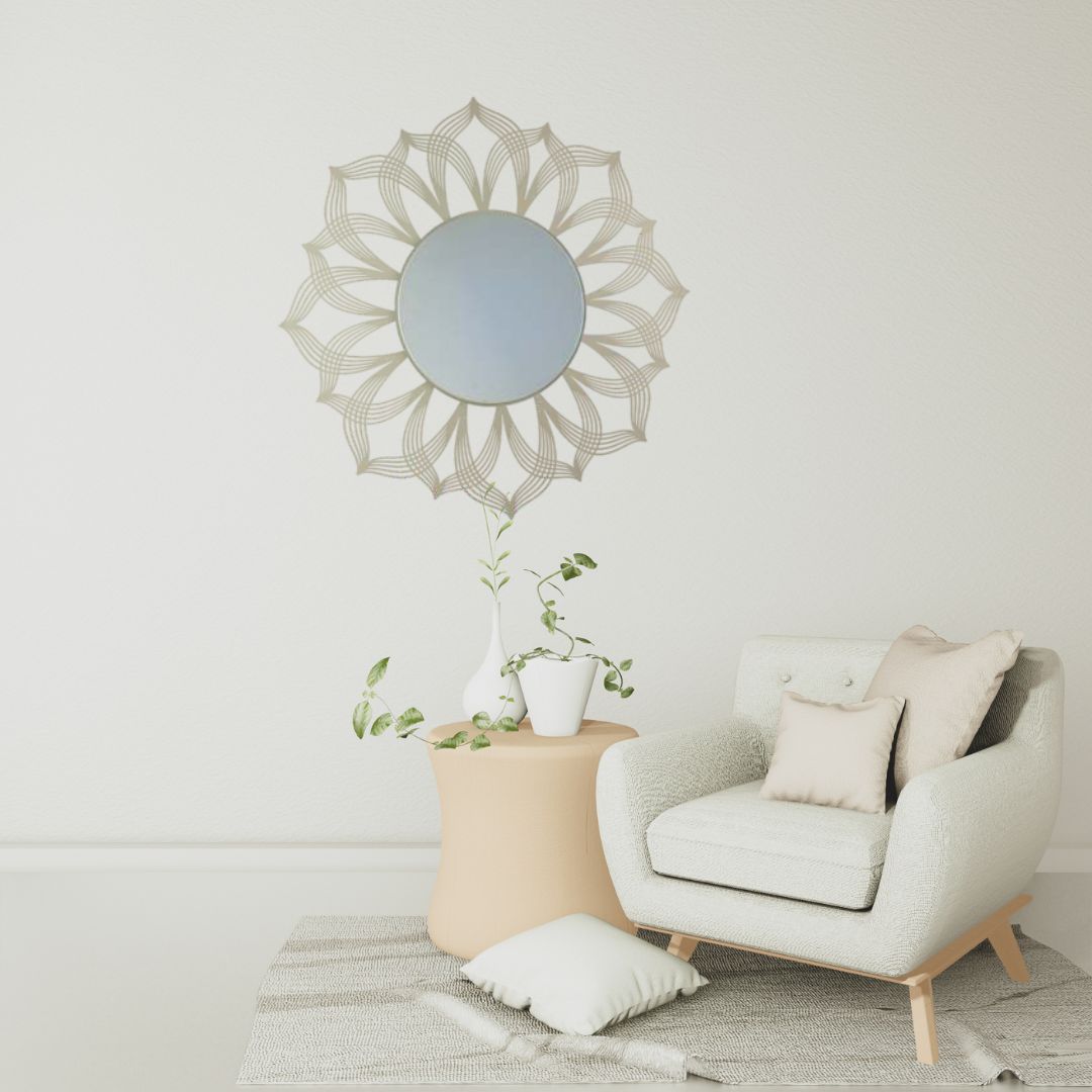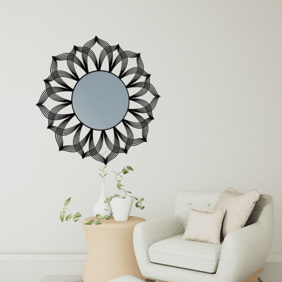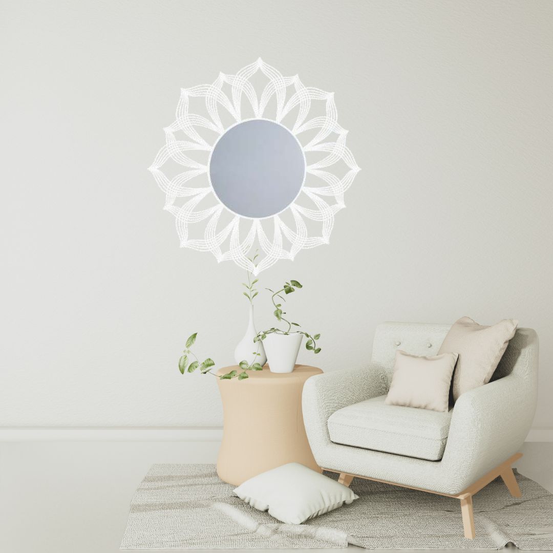 Specchio rotondo di grandi dimensioni (diametro 80 cm) con struttura in metallo tagliata al laser, impreziosita da un disegno geometrico simmetrico ispirato a forme naturali come i fiori.