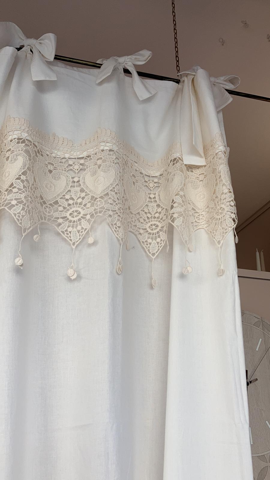 ELEGANTE E ROMANTICA  TENDA IN MISTO LINO E CON RAFFINATI DETTAGLI IN MACRAME’ ,ABBINABILE A CUSCINI ,PIUMONI,RUNNER,CENTROTAVOLA DELLA STESSA LINEA ” CUORE” .