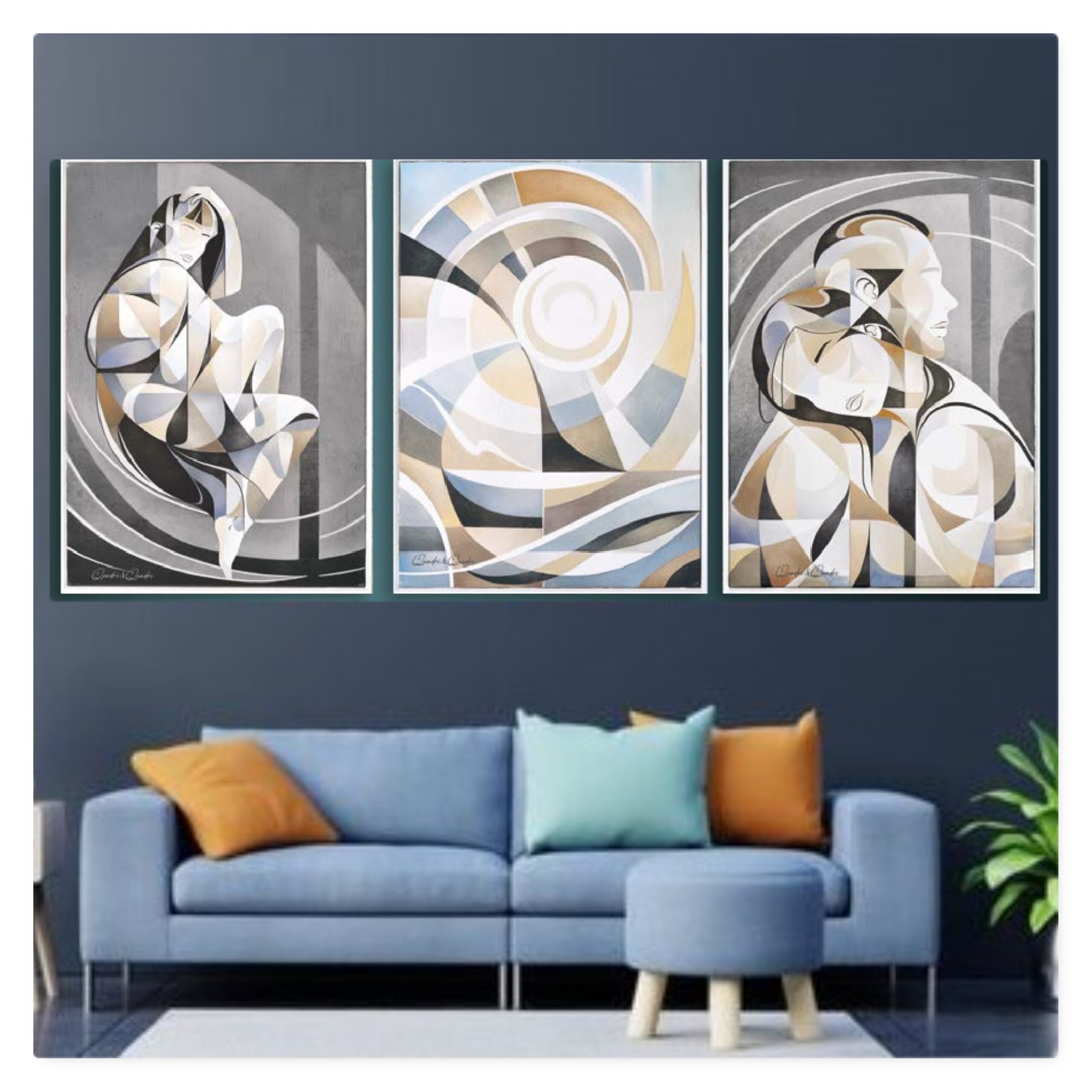 Ogni trittico è composto da tre quadri verticali, ognuno caratterizzato da una stampa ad alta risoluzione con pennellate a rilievo dipinte a mano, rendendo ogni pezzo veramente speciale.